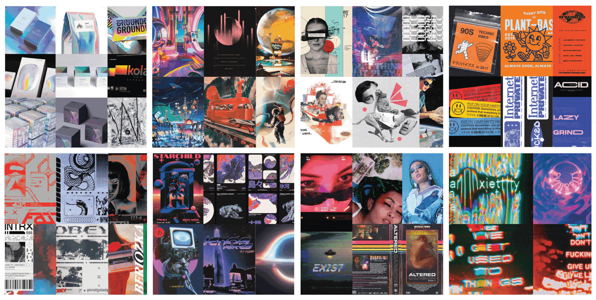 The client had many initial requests based on their interpretation of trends in other consumables and in illicit market visuals. I combined their stated preferences with my knowledge to come to initial mood board directions looking at: futurism, grunge, nostalgia, iridescence, and distortion.